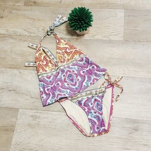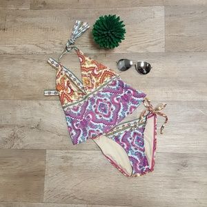Very gently used multicolored 2 piece BOHO swimsuit. Halter tie top. 2 ties...ties around neck and middle of back. Bikini bottom with ties on each side accented with metal beads.