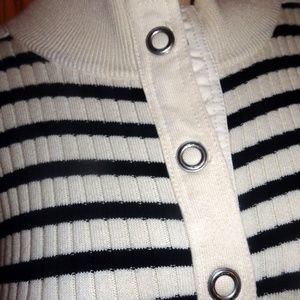Snap neck, white band on shoulders and down sleeves