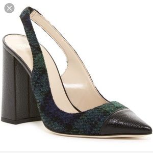 Worn several times but in excellent condition π wool and leather upper with appx 4β heel. Stretch on the slingback ya make these easy to walk in. Fits true to size