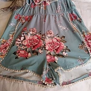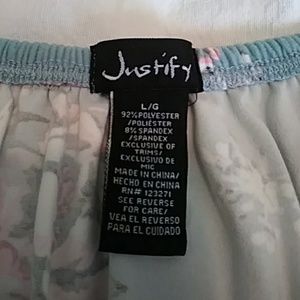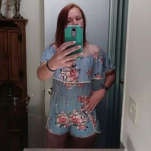 Justify Off Shoulder blue and rose floral romper. Very soft material looks STUNNING WITH. NUDE WEDGES!!! Wore only once to a baby shower and I got so many compliments! Absolutely beautiful. I am a size Medium amd this Large size fits perfectly.