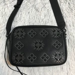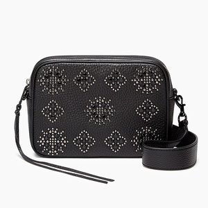 Brand new! Rebecca Minkoff Medium Stargazing Black Camera Bag. Genuine pebbled leather with cuatom black hardware. Embellished studded details on front. Has long crossbody strap that is adjustable and fully removable. Back slip pocket. Never worn, comes with original care card, care booklet, and extra leather replacement tassels! From pet free and smoke free home!