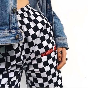 Sullen girl checkered pants