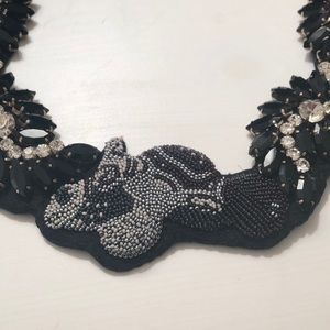 Silk chiffon necklace. Hand-embellished with beads and crystals with covered snap closure. Beaded fish detail. Never worn - new without tags.