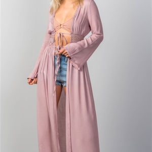 Kimono / Cover-Up features: long sleeves, longline, open front, front self-tie, bohemian style