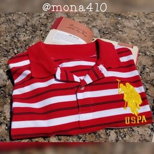 Red & white striped U.S. Polo Assn. polo shirt. USPA emblem in yellow on front left chest, number 3 in yellow on right sleeve. Tag was removed, but it is size Large (Jr). Excellent, like new condition.