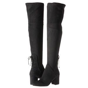 Super cute black thigh high boots with detailing on the ankle area. These are a wide fit so great and comfy for people who have wider feet. Lightly worn, less than five times.