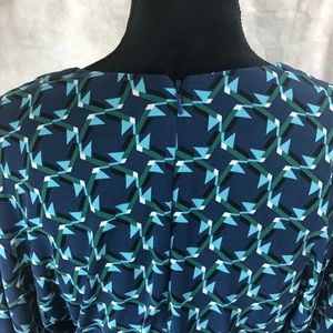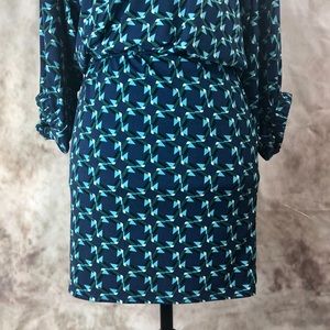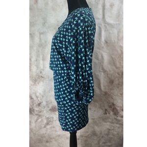 Women’s size 0. In excellent pre owned condition, beautiful turquoise and blue patterned mini dress. Fully lined, 3/4 balloon hemmed sleeves. blouse top and fitted mini skirt with a removable tie waist. Zippered back closure. Polyester/nylon blend with a hint of stretch. Dress has no defects or blemishes.