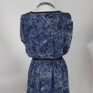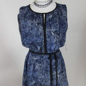 FYLO NWT Navy, Royal Blue, White, and Black Abstract Print Sleeveless Fully-Lined Rounded Neck Women's Sheath Dress, Size L/G. This stylish and sophisticated fully-lined pullover dress has a beautiful navy, royal blue, white, and black color hue, abstract print design pattern, sleeveless detail, rounded neck, keyhole opening on front bodice, elastic waist, blouson bodice, and a black tie belt. Measurements = 36", Bust = 40", Waist = 30" (Stretched = 34").
