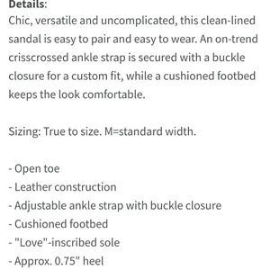 Cute leather sandals, strap crosses in front and buckles on the side. Great sandal with all your summer attire! NWOB