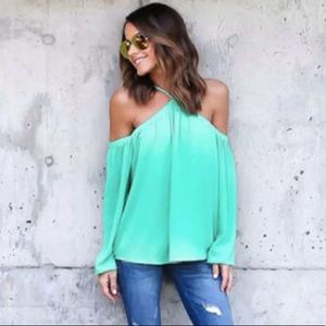 Green flowy summer top. Off the shoulder sleeves. Halter neck. Very sexy! Runs true to size.