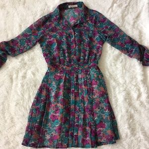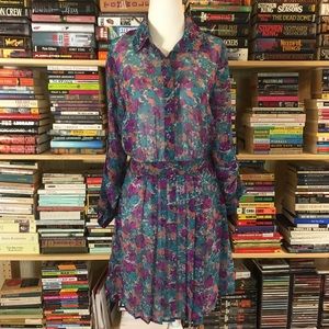 Lovely floral printed dress from BCBG. Great mix of colors - violet, teal and orange. The skirt is pleated. The top of the dress is a button-down. Roll-tab sleeves. Side zip. There’s some minor wear in the form of several small thread pulls.