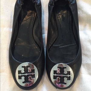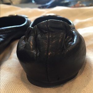 Black flats, scuffs and light scratches. Silver tone double T logo