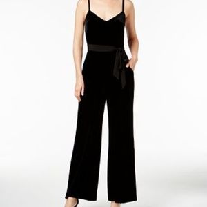 Brand New with tags!! Fun and chic alternative to a little black dress LBD. Wide-leg velvet jumpsuit from Calvin Klein, tied at the waist for a flattering finish. Hidden back zipper.