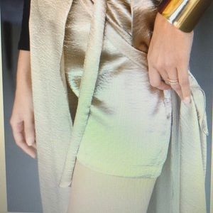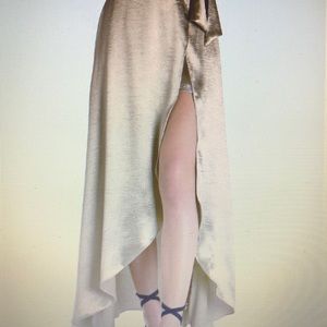 Check out this long gold skirt. Look at these pics. You are a golden goddess in shimmering, silky-textured metallic wrap maxi skirt with an attached undershorts that lets you bare your sexy legs through a split hi-lo hem. Undershort has hidden zip with a hook and bar clousure; skirt has a side tie. Both are unlined, Pictured with black vegan Bomber.