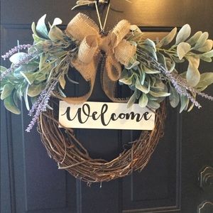 17” wreath with lambs ear, lavender, and a white distressed wood sign. Lettering is black. SIGN IS NOT ATTACHED TO WREATH, it fits down into the grapevines.