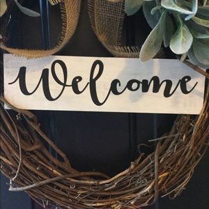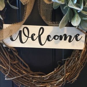 Lambs ear wreath with white wooden distressed sign