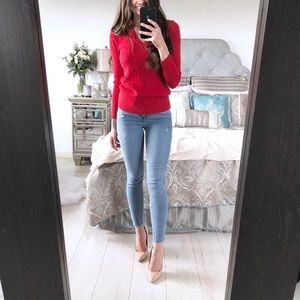 Love this casual v Neck Top! Red has definitely been the it color for a while now, and look how cute it looks with denim and nude heels! Super comfy and durable material!