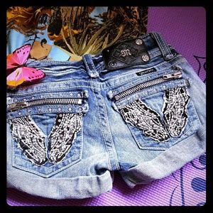 Studded wing embellished size 23 Miss Me shorts. I LOVE these but they no longer fit me. My loss is your gain. Lightly worn, missing 2 label studs, otherwise good condition. Inseam is only two and half inches so they're short short, and fit on the small side.