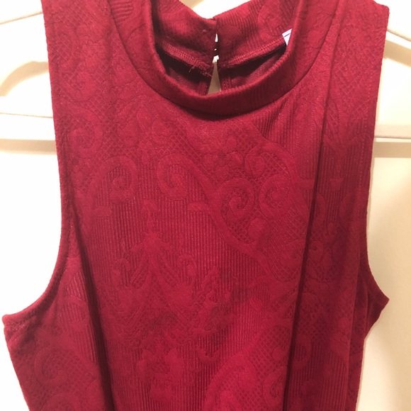 deep red dress from franchessica’s. high neckline and elastic waistband