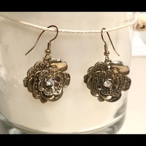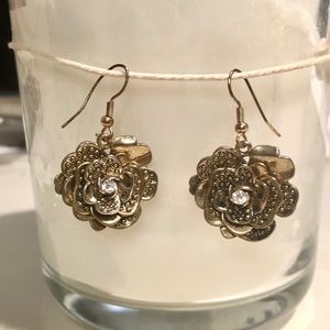 Stunning fun and unique gold plated earrings nickel free with a faux diamond in the center! These have been worn before but since cleaned and in like new condition! They would be great for you to treat yourself or for a gift !