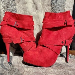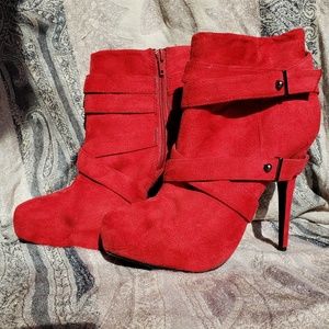 These red suede strappy boots are a size 9 and they are an amazing pop of color to brighten any outfit or coordinate with! Only worn once!