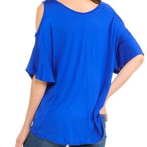 Beautiful Royal Blue, Anchor Graphic, Loose Fit, Flutter Sleeves Top with Cold Shoulder and High Low Sweep. Soft stretchy feel. Light and cool. Perfect for seaside days or island hopping. Casual or resort wear. Style it up with leggings or skinny jeans. Fabric: 95% Rayon, 5% Spandex. NOTE: Royal Blue color may slightly differ from images due to lighting. Color shade is very close to images with beach background.