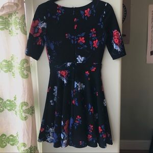 Beautiful and billowy A-line floral dress! Black with pink, blue, purple flowers. Stretch-knit bodice, fitted waist, and flowy skater skirt. Sleeves are elbow length. Black zipper in back.