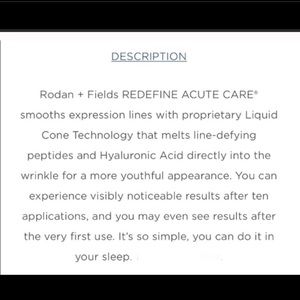 Rodan + Fields® REDEFINE ACUTE CARE™ Skincare for Expression Lines. Each ACUTE CARE strip holds more than one hundred microscopic liquid cones that melt into lines and wrinkles for smoother, more youthful-looking skin. Results can last up to 12 Weeks