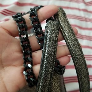 VA/BRASS Metallic leather| Inside zip, cell phone and multifunction pockets| Zip closure, fabric lining| Handle with 9 1/2" drop| Double strap with 18" drop for shoulder or crossbody wear| 11 1/2" (L) x 6 3/4" (H) x 5 1/4" (W) gently use in excellent condition