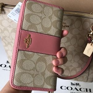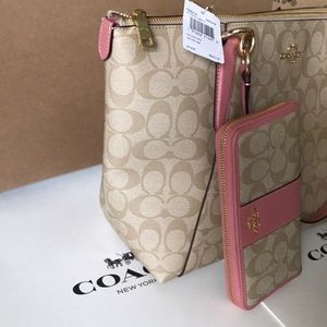 🆕Both bag and wallet 💯authentic brand new with tags. Signature Ava tote shoulder bag style match wallet many compartments fit any your choice zip round. Light khaki signature vintage pink colors gold hard wear. Large size bag.