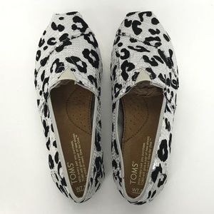 TOMS Shoes Womens 7.5 Silver Black Sequin Leopard Cheetah Animal Print Slip Ons