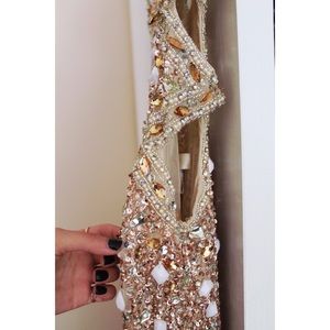 Beautiful Shiny Glam Prom/Evening gown. There are colored champagne beads through out the dress. The dress also has cut outs on the sides and a slit down the lower part. Very slim and contouring to the body. Dress is in very good condition, slightly worn at the bottom.