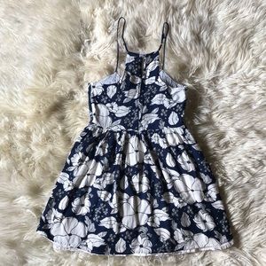 Francesca’s Collection blue and white floral dress. The top features blue lace and adjustable spaghetti straps. Fit and flare style in great condition. Length 34” bust 16.” Size Small.