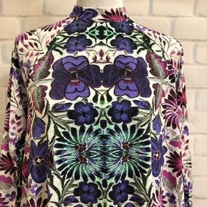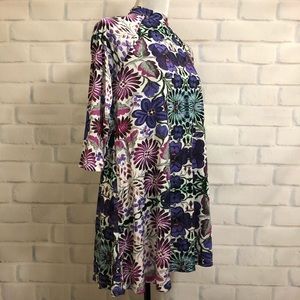 Adorable swing dress. White background with primarily purple flowers. 3/4 raglan sleeves. Choker style neckline with cut-out in back. Great condition. Approximate measurements 20.5" sleeve from neckline, 19" across chest, 34.5" across bottom hem, 31" shoulder to hem.