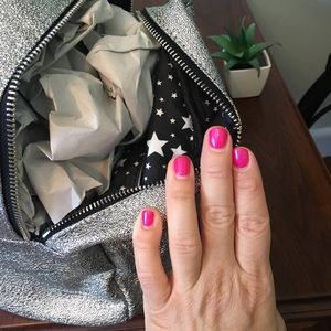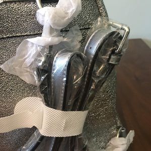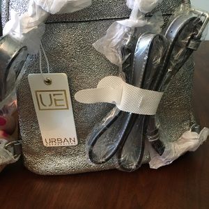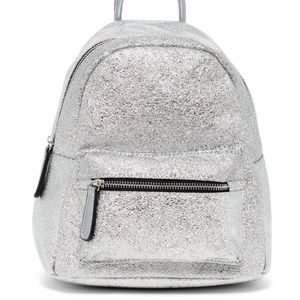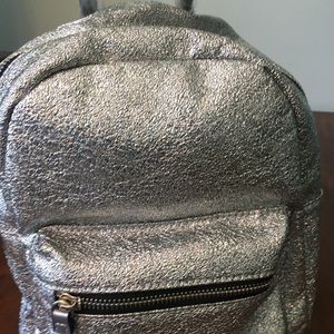 🌿Urban Expressions Mini backpack , shimmery silver vegan leather. So eye catching! Zip closure , adjustable & removable straps. Measures approx 10 “ x 8” x 7” . One zip pocket and one open pocket inside . 🌿. Dust bag included