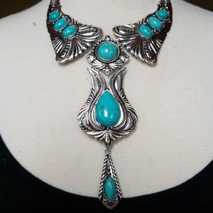 Statement necklace set in Silvertone and Turquoise with matching drop hook earrings.