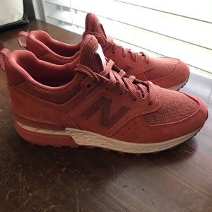 Women’s New Balance 574 sneakers. Only worn once! These sneakers are just about brand new as you can tell from the pictures. These sneakers are a peach color, very cute for the summer! Kept in a smoke and pet free household.