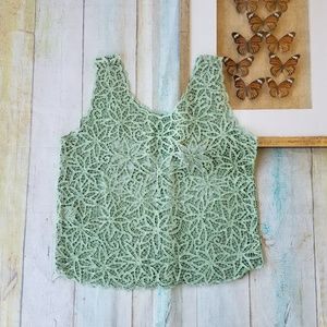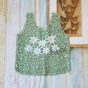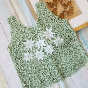 Sheer intricate crochet with white floral detail on the front. Straight fit. No brand label. Bust measures approx 38" so I estimate it to be a large. Slight give in the fabric but not stretchy. In good condition.