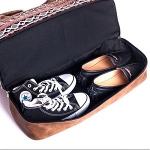 Canvas top with aztec pattern, brown faux leather bottom & accents, comes with adjustable shoulder strap, has bottom shoe compartment with zipper closure, metal feet on the bottom, an airline-friendly carry-on, 24in(L) 13in(H) 7.5in(W)
