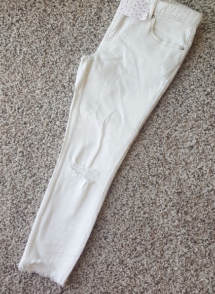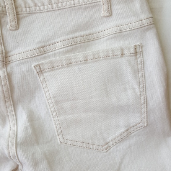 Off white colored denim. Destroyed detail both knees. Cropped fit. 25 inch inseam. Frayed hem. Has some stretch. 98% cotton, 2% spandex.