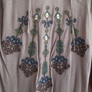 Love this top and never seen one like it! It's a taupe color with beautiful detail in turquoise, burgundy, silver and gold