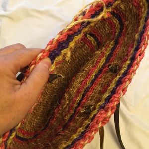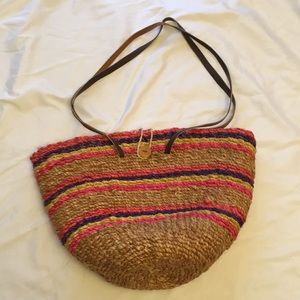 This straw handbag is perfect for summer! Pink, yellow, and purple stripes. Approximately 11 inches deep. Leather straps.