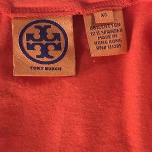 Tory Burch Top - A beautiful Top in XS; made of sPandex and cotton for flexibility and comfort in citrus orange and gold motif color. Pre-loved in great condition.