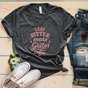 Custom-made grey vneck tshirt by Plum Creek Boutique, adorned with rose gold design "less bitter, more glitter".