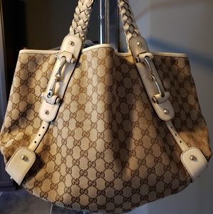 Great Authentic Gucci Shoulder bag! In excellent condition! Canvas bag with leather details, color cream.