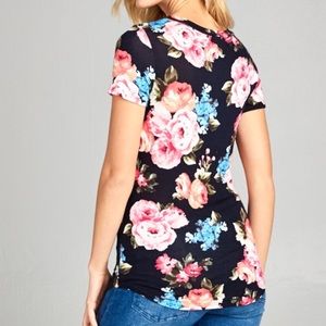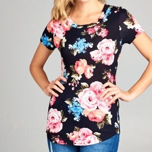 Short sleeve, round neck floral printed top, navy background. 95% rayon & 5% spandex. Rounded bottom