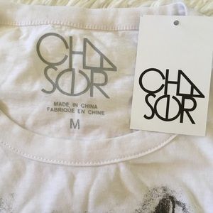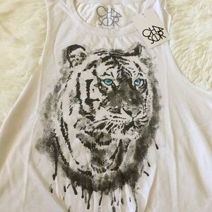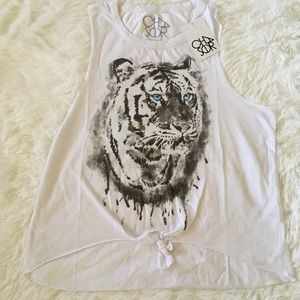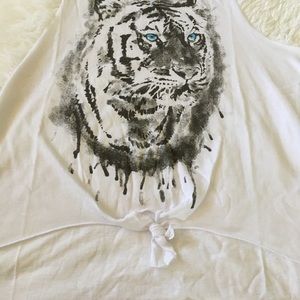 Sleeveless, front-tie muscle tee from Chaser. Has a black and white painterly image (complete with drip marks) of an elegant tiger with contrasting bold blue eyes. Hi-lo raw hem with a tie in front. Brand new with tag.
