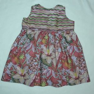 This handmade dresses is made of 100% cotton fabric Chevron striped bodice sewn on apron and a floral print skirt. Buttons at shoulder.