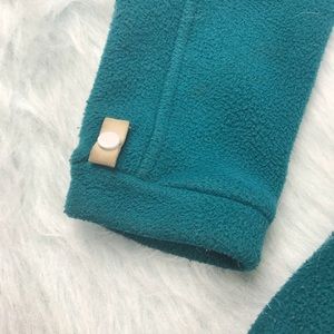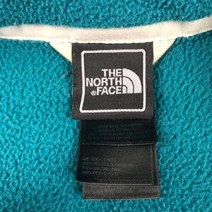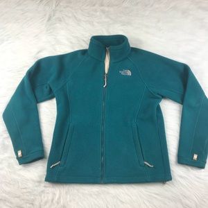 Women’s size small The North Face fleece full-zip jacket. Teal green in color. Small stain on sleeve and light fabric pilling. Overall still a nice jacket!