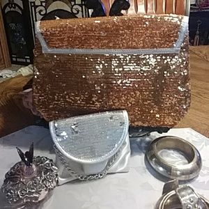 Gold sequin and silver combination set very roomy and cute. Big bag 11" X 8" X 2.5 depth. The small bag with chain 4" X 5.5" both make a nice combo. Brand new.💋 🌹Bundle and save. Nice gift to a special gal.